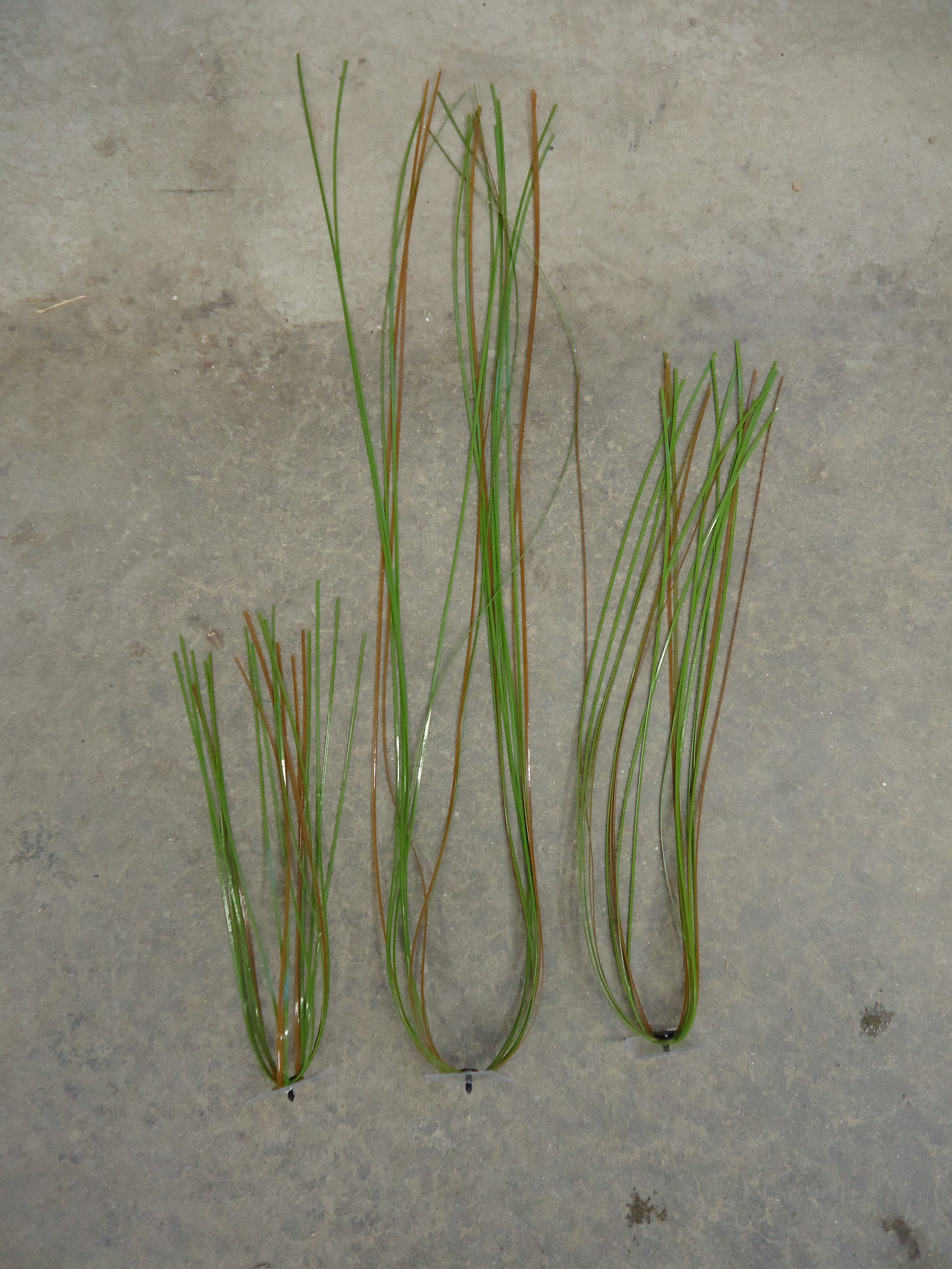 Surf Grass Phyllospadix grows on surfy shores from intertidal levels down to 15 meters. Its long narrow blades (2 mm) flow with the surge of waves and currents. At low tide, exposed rock are often draped with this grass.