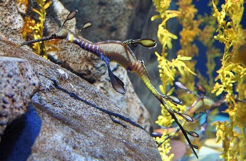 Sargassum algae occurs in vast areas of the Atlantic Ocean as free-floating rafts near the surface. Many animals take refuge in its protective tangle of golden blades and bladders.